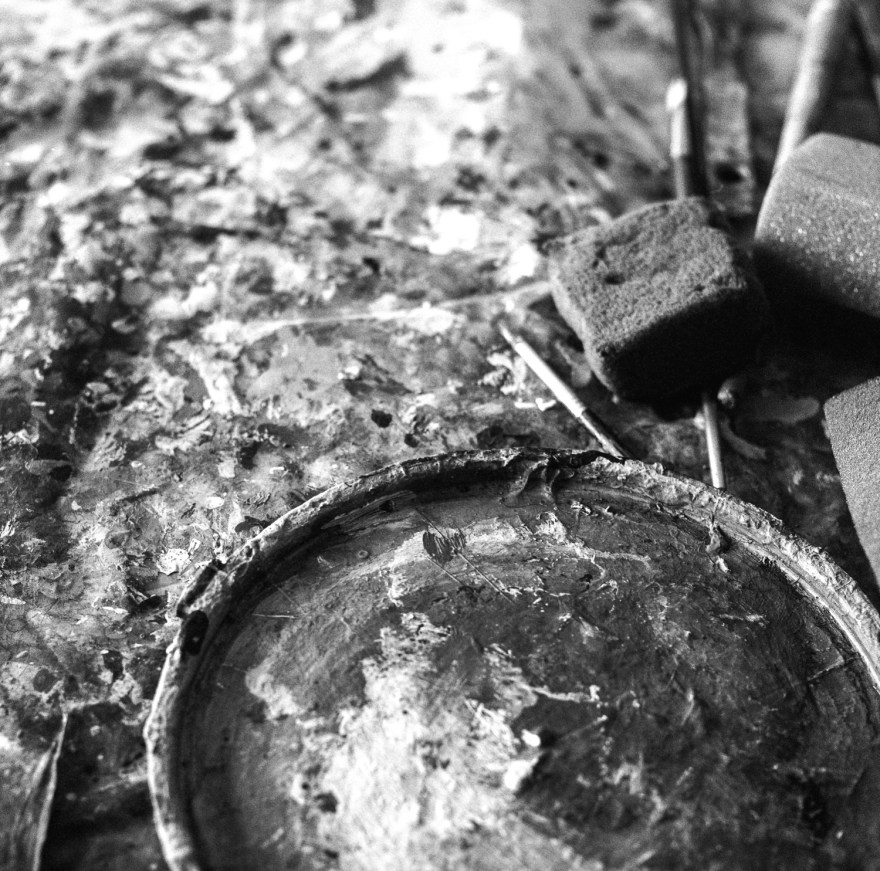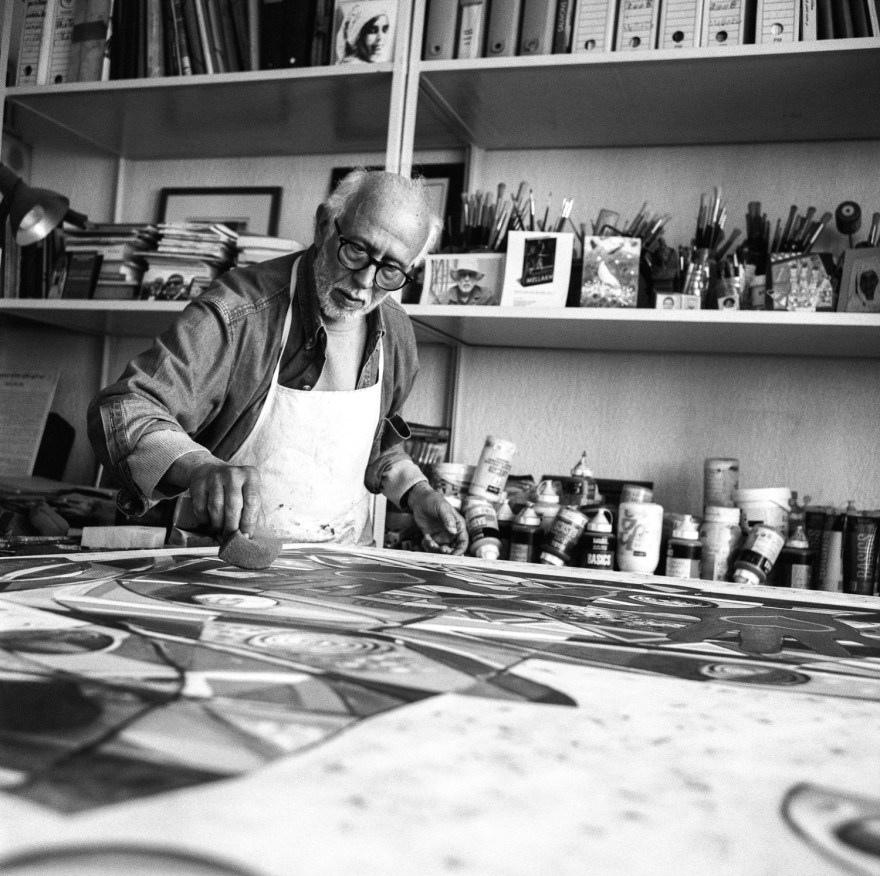 Ainsi, à la valse des souvenirs de chacun succéda le partage de quelques après-midi dans son atelier de Casablanca. Abdelhay Mellakh semblait peindre pour lui, baigné d’une lumière blanche de printemps, bercé par les programmes radio et la rumeur qui nous parvenait de la rue. Le temps paraissait s’étirer, et peut-être devais-je cette sensation aux nombreux portraits et souvenirs qui ornaient les étagères de la pièce. Les regards de toute une vie se posant sur nous brouillaient les frontières du temps, qui ne devait plus son rythme qu’aux coups de pinceaux du maître.