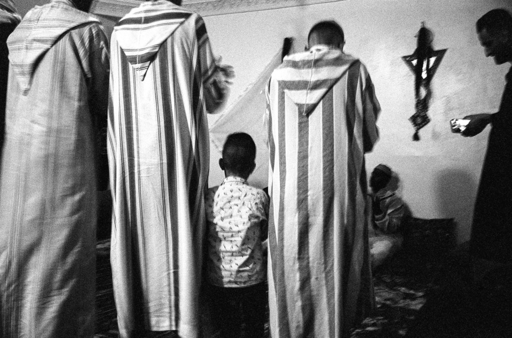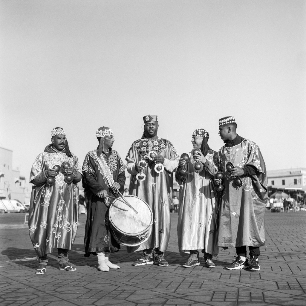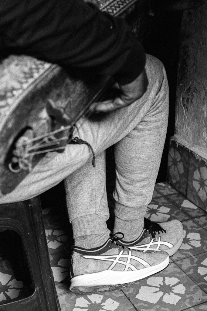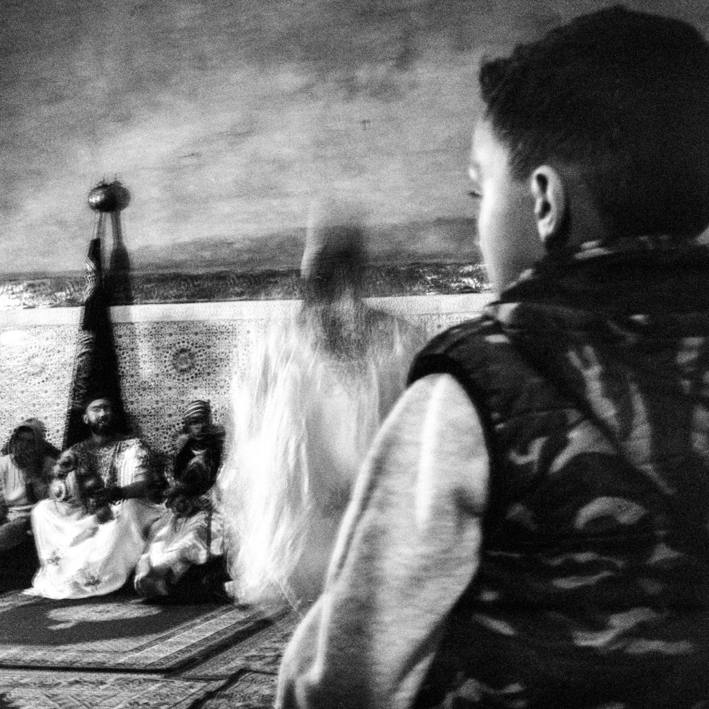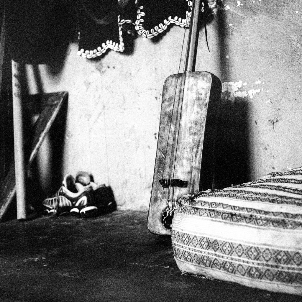 Ma photographie s’est parfois heurtée aux portes du sacré. Mais cela a peu d’importance, j’ai reçu tout ce qu’on m’a donné, saisi par une intensité collective qui me devint peu à peu familière mais à laquelle je n’appartiendrai jamais réellement. J’ai parcouru la ville de Marrakech, en quête de savoir, de Ben Saleh à Bab Hmar, de Mouassine à la Kasbah. Dans un vertige de poussière ocre et les volutes de jawi. j’ai embrassé les lignes mélodiques de quelque chose que je ne comprenais pas toujours. Aux maâlmin, par respect et gratitude, j’ai apporté des offrandes, des dattes, du lait, du sucre et du café, comme on me l’a enseigné. En retour, on m’a transmis la baraka, force vitale bénéfique, au principe divin. Aux côtés d’une jeunesse qui m’a ouvert les bras, je me suis assis et j’ai écouté. J’ai photographié ce qu’ensemble nous avons vécu, un quotidien bercé entre tradition et modernité. Les longs après-midi dans les funduq de la médina, le thé, les trajets en moto dans les ruelles étroites et bondées de touristes, en direction d’un concert ou d’une lila, des pellicules plein les poches et ma guitare sur le dos. Cette guitare qui m’accompagne autant que mes appareils photos, achetée dans une boutique du Derb Kenaria il y a déjà plusieurs années et qui m’attend là-bas, au pays des Fils de Bambara dans le coin d’un restaurant. Cette guitare de mauvaise facture, dont l’une des pièces a disparu, offerte à un musicien qui en avait besoin, constitua le point de passage vers mon entrée en Tagnawît.