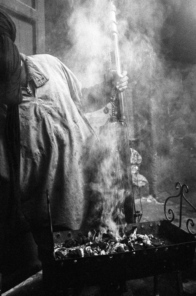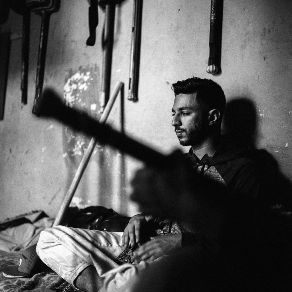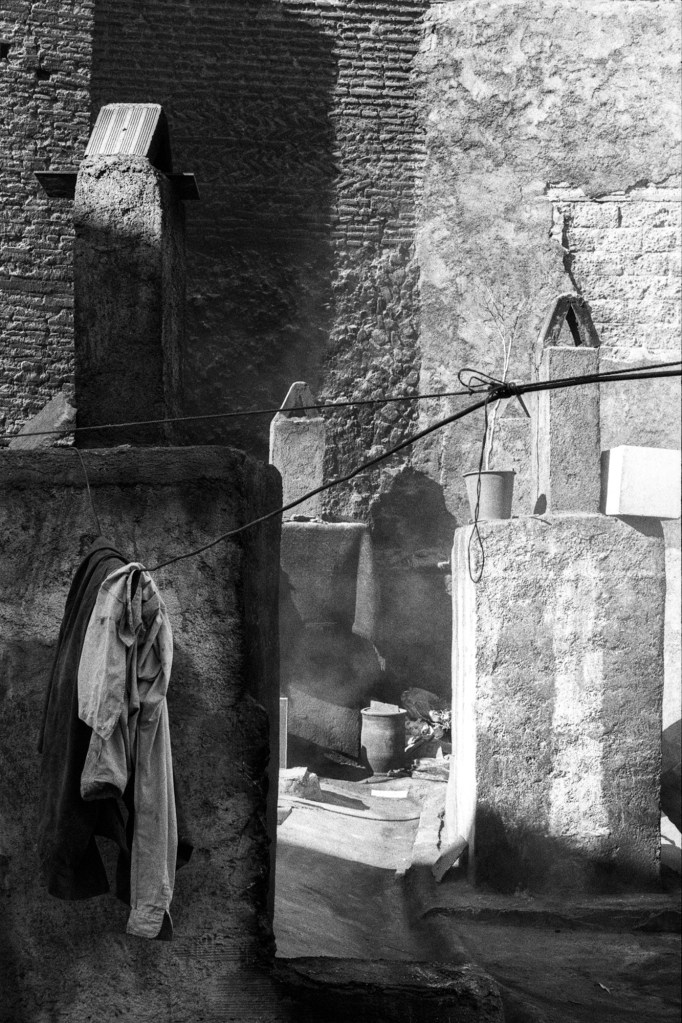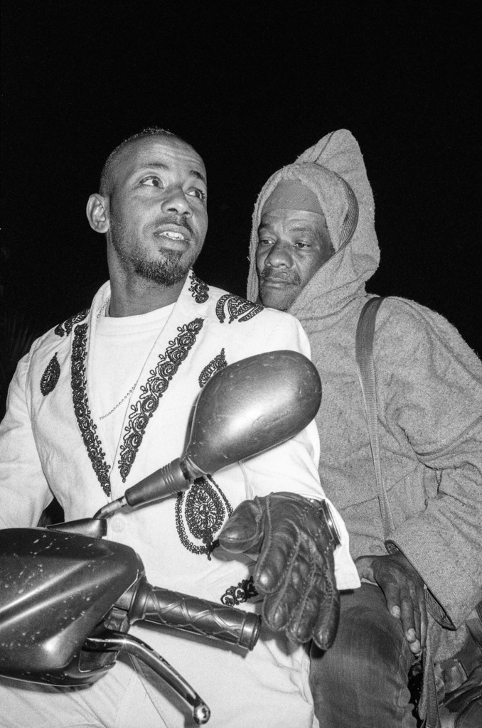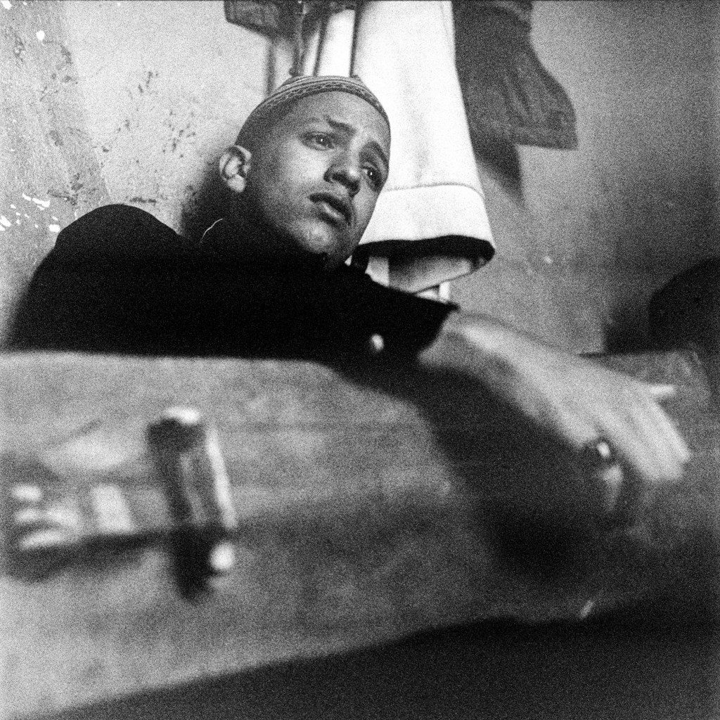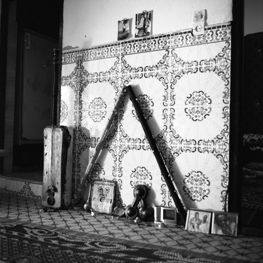 Ma photographie s’est parfois heurtée aux portes du sacré. Mais cela a peu d’importance, j’ai reçu tout ce qu’on m’a donné, saisi par une intensité collective qui me devint peu à peu familière mais à laquelle je n’appartiendrai jamais réellement. J’ai parcouru la ville de Marrakech, en quête de savoir, de Ben Saleh à Bab Hmar, de Mouassine à la Kasbah. Dans un vertige de poussière ocre et les volutes de jawi. j’ai embrassé les lignes mélodiques de quelque chose que je ne comprenais pas toujours. Aux maâlmin, par respect et gratitude, j’ai apporté des offrandes, des dattes, du lait, du sucre et du café, comme on me l’a enseigné. En retour, on m’a transmis la baraka, force vitale bénéfique, au principe divin. Aux côtés d’une jeunesse qui m’a ouvert les bras, je me suis assis et j’ai écouté. J’ai photographié ce qu’ensemble nous avons vécu, un quotidien bercé entre tradition et modernité. Les longs après-midi dans les funduq de la médina, le thé, les trajets en moto dans les ruelles étroites et bondées de touristes, en direction d’un concert ou d’une lila, des pellicules plein les poches et ma guitare sur le dos. Cette guitare qui m’accompagne autant que mes appareils photos, achetée dans une boutique du Derb Kenaria il y a déjà plusieurs années et qui m’attend là-bas, au pays des Fils de Bambara dans le coin d’un restaurant. Cette guitare de mauvaise facture, dont l’une des pièces a disparu, offerte à un musicien qui en avait besoin, constitua le point de passage vers mon entrée en Tagnawît.
